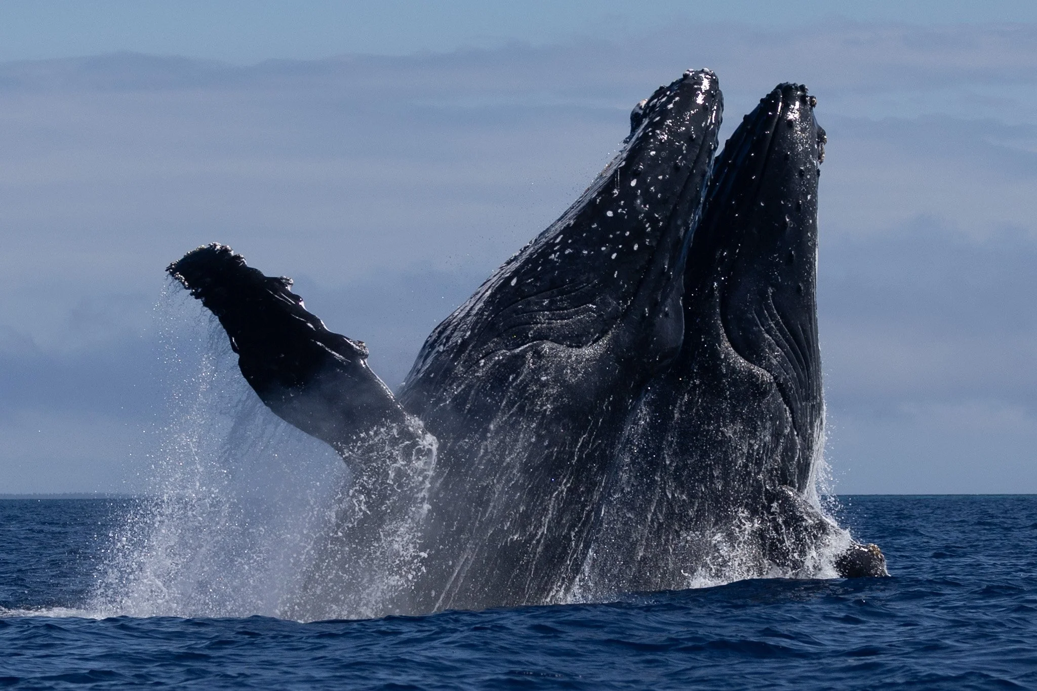 Every day of whale watching is different with a vast array of interesting behaviour to witness - from the "blow" shaped like a love heart, a graceful spy hop, powerful fin or fluke slaps to continual full body breaching and inquisitive approaches to the boat. Using our hydrophone (waterproof microphone) we can sometimes listen to their magical love songs even when they are out of sight.